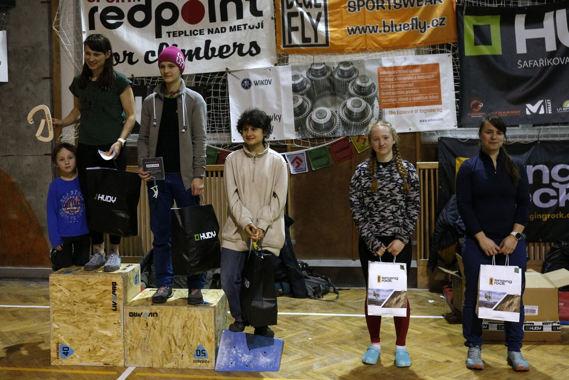 Trio stavěčů připravili tři kvalifikace a dvě finálové cesty, které lezcům prověřily každý kousek těla. Sál se s postupujícím časem a blížícím se finálem slušně zaplnil diváky. Pro prvenství si dolezla Kateřina Zímová, druhé místo brala Míša Hornychová těsně před Markétou Sýkorovou. Po úpravě cesty pro chlapy pokračujeme ve čtyři prohlídkou. Z mužů nakonec nejdál dolezl Lukáš Uherec, dva kroky od topu. Za ním skončil silák Jan Novák a třetí tradiční účastník Jan Zíma.
