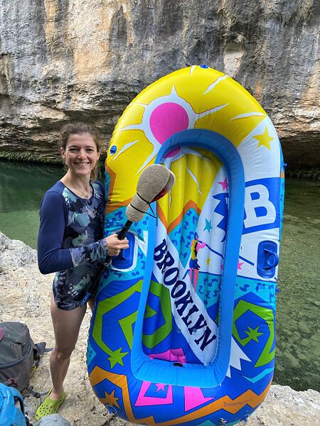 Prudence: Je tak těžké si vybrat! Je tady tolik skvělých sektorů! Musím říct, že miluji dobrodružství, když jdu do sektoru La Piscineta. Musíš se tam vydat lodí po 500 metrů dlouhém úseku řeky a pak jít dalších asi 20 minut proti proudu vody, aby ses k němu dostal! Dále se musíš brodit podél řeky nebo skákat přes kameny. Sice existuje prý ještě jedna další cesta z Mascun údolí, ale bylo nám řečeno, že je obtížné ji najít a přiznejme si, že na lodi je to mnohem větší zábava! No, říkám sice na lodi, ale v našem případě je to „dětský nafukovací plážový člun“! (směje se od ucha k uchu)